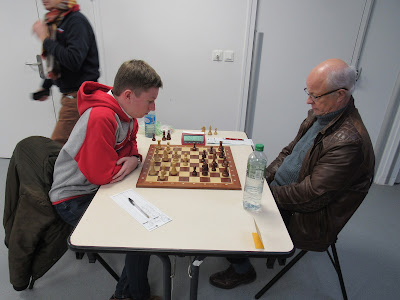 Table 5, Marvin (1536 F) joue contre Luc Boet (1428 F). Une partie bien gérée de bout en bout même si en milieu de jeu Marvin a dû prendre du temps pour bien calculer dans une position complexe. Il lui reste alors peu de temps à la pendule mais suffisant pour remporter la partie. 4 à 0 pour Baud et match gagné.